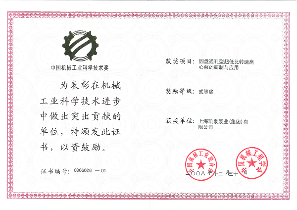 集團圓盤通孔型超低比轉(zhuǎn)速離心泵的研制與應(yīng)用榮獲“中國機械工業(yè)科學(xué)技術(shù)二等獎”