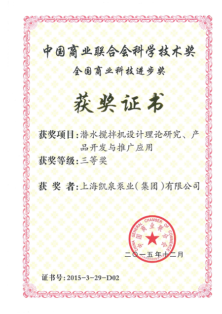 集團潛水?dāng)嚢铏C設(shè)計理論研究、產(chǎn)品開發(fā)與推廣應(yīng)用榮獲“全國商業(yè)科技進(jìn)步三等獎”