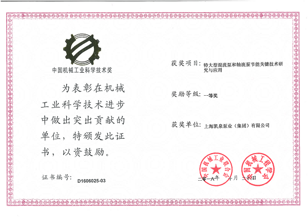 集團特大型混流泵和軸流泵技術(shù)研發(fā)與應(yīng)用榮獲“中國機械工業(yè)科學(xué)技術(shù)獎一等獎”