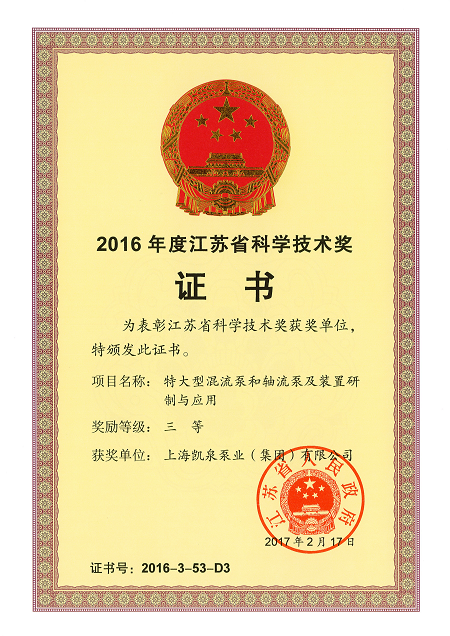 集團特大型混流泵和軸流泵及裝置研制與應(yīng)用榮獲“江蘇省科學(xué)技術(shù)三等獎”