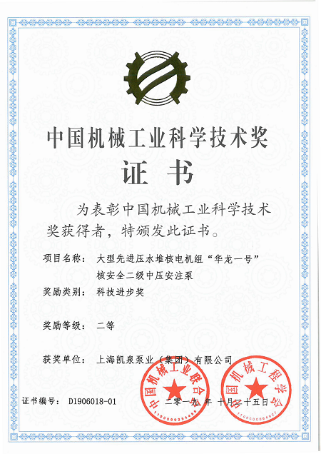 集團大型先進(jìn)壓水堆核電機組“華龍一號”核安全二級中壓安注泵榮獲“中國機械工業(yè)科學(xué)技術(shù)獎二等獎”