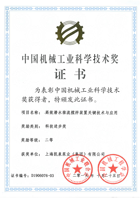 集團高效潛水推流攪拌裝置關(guān)鍵技術(shù)與應(yīng)用榮獲“中國機械工業(yè)科學(xué)技術(shù)獎二等獎”