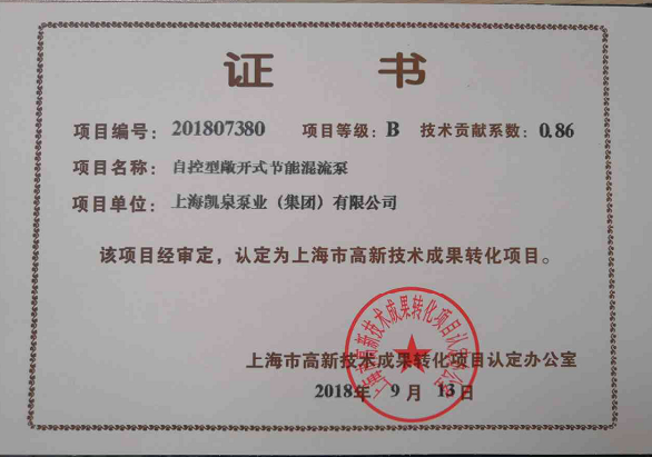 集團自控型敞開式節(jié)能混流泵被認(rèn)定為“上海市高新技術(shù)成果轉(zhuǎn)化項目”