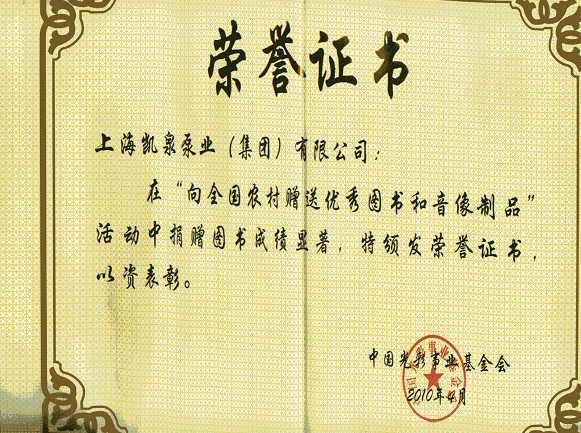 集團“向全國農(nóng)村贈送優(yōu)秀圖書和音像制品”捐贈榮譽證書