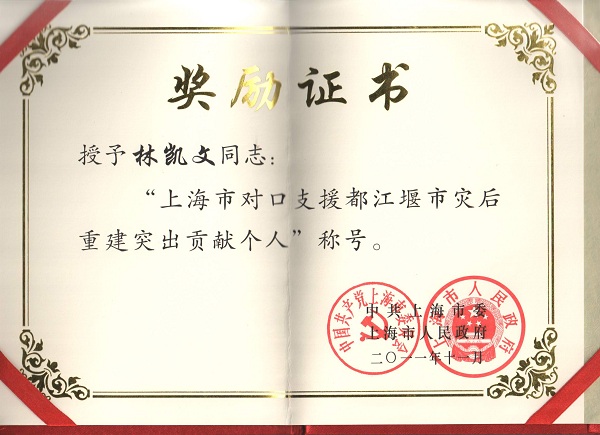集團董事長林凱文榮獲“上海市對口支援都江堰市災(zāi)后重建突出貢獻(xiàn)個人”稱號