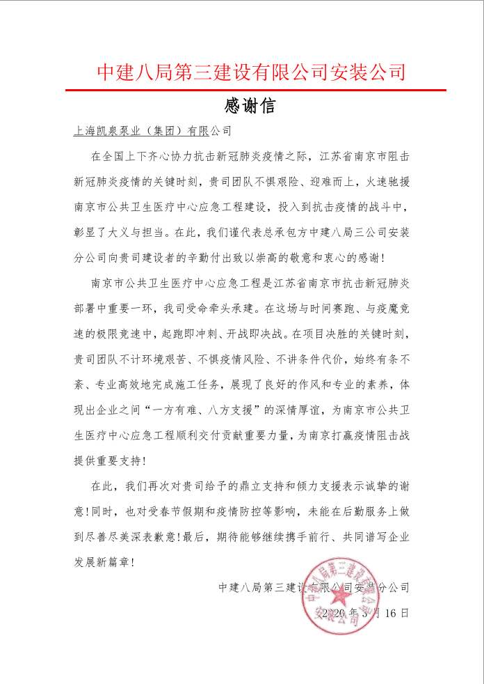 集團馳援抗疫收獲中建八局第三建設(shè)感謝信