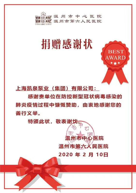 集團捐贈溫州市中心醫(yī)院感謝證書