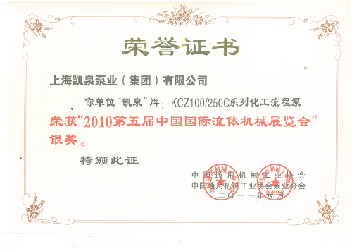 KCZ100_250C系列化工流程泵榮獲_2010第五屆中國國際流體機械展覽會_銀獎312