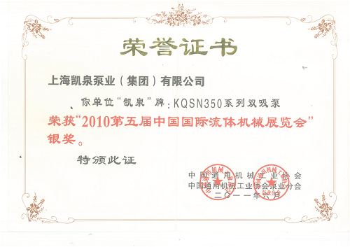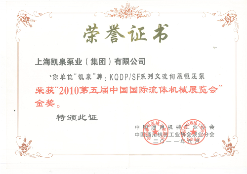 KQDP_SF系列交流伺服恒壓泵榮獲_2010第五屆中國國際流體機械展覽會_金獎313