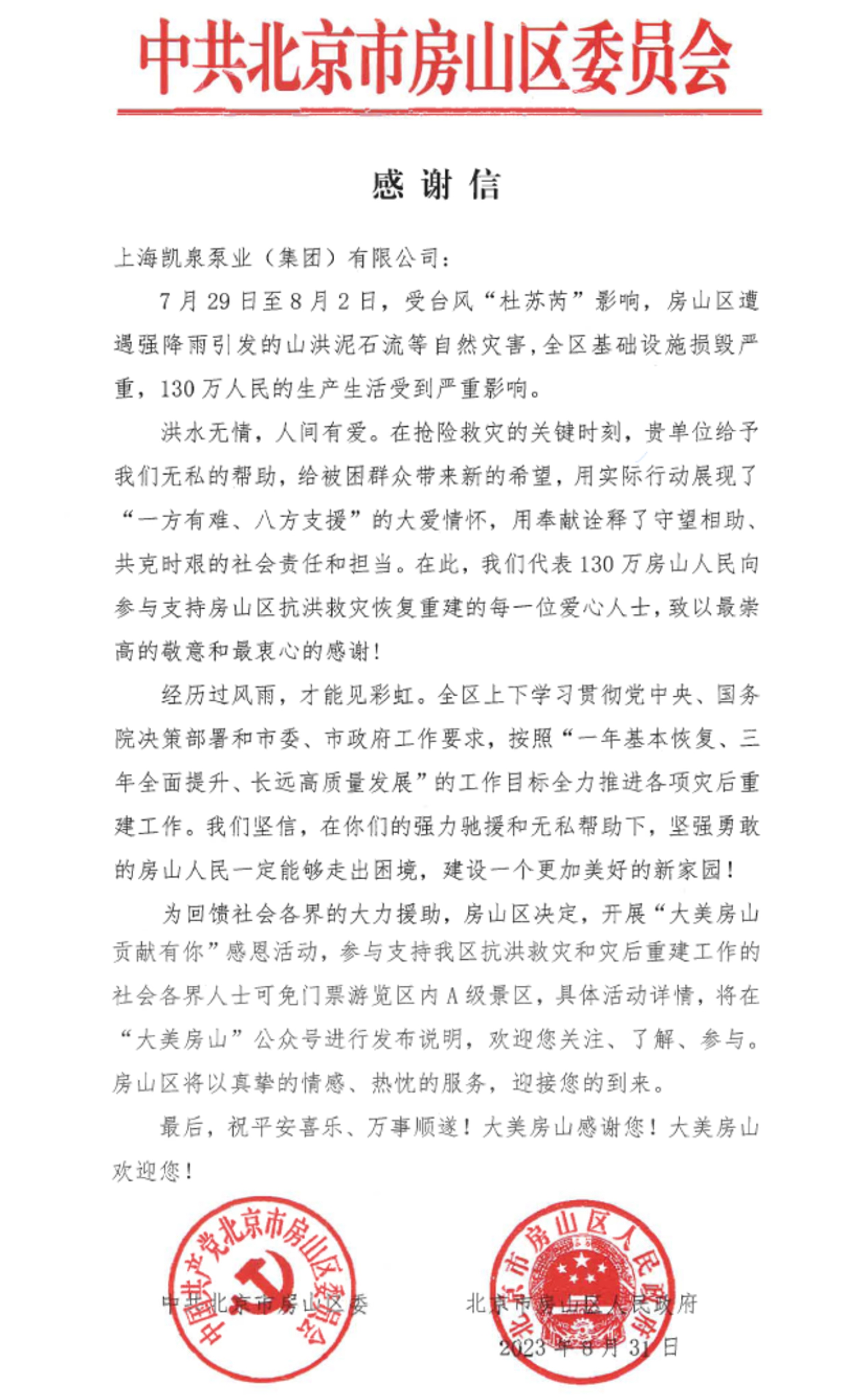 集團收到北京房山區(qū)委感謝信